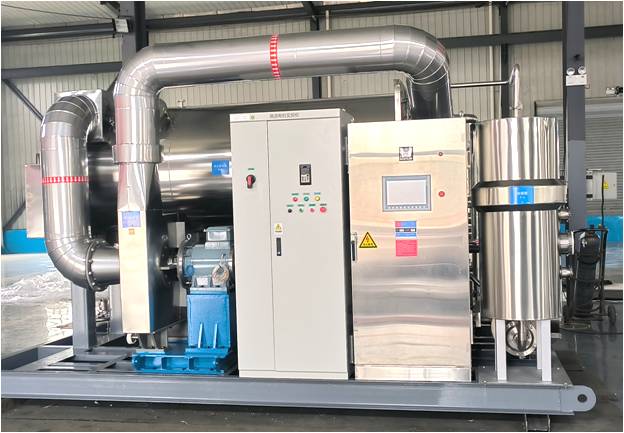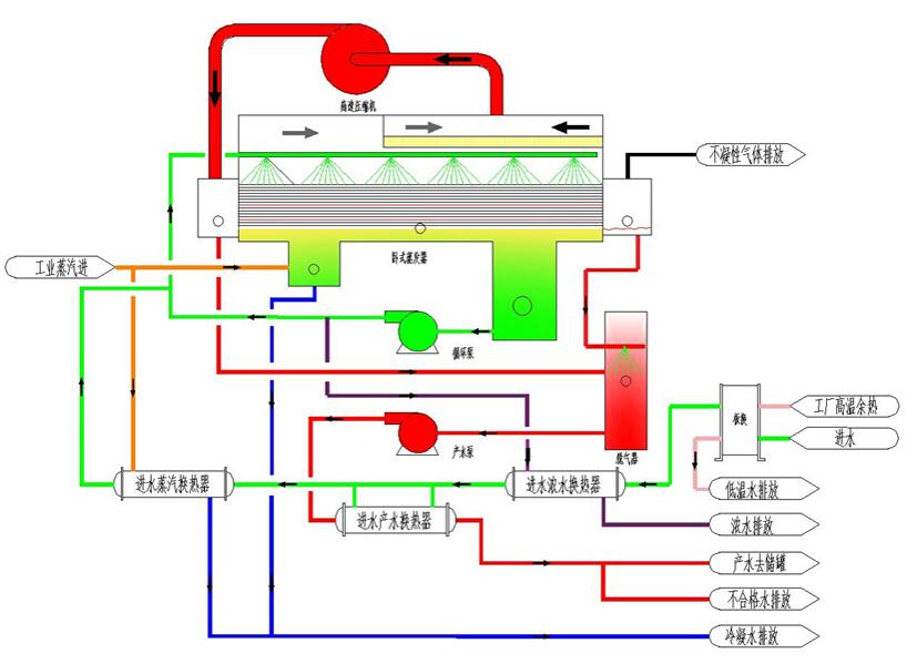 The principle of VC is to use industrial steam or electric heating to purify water, producing clean steam, which is compressed and condensed to produce distilled water.