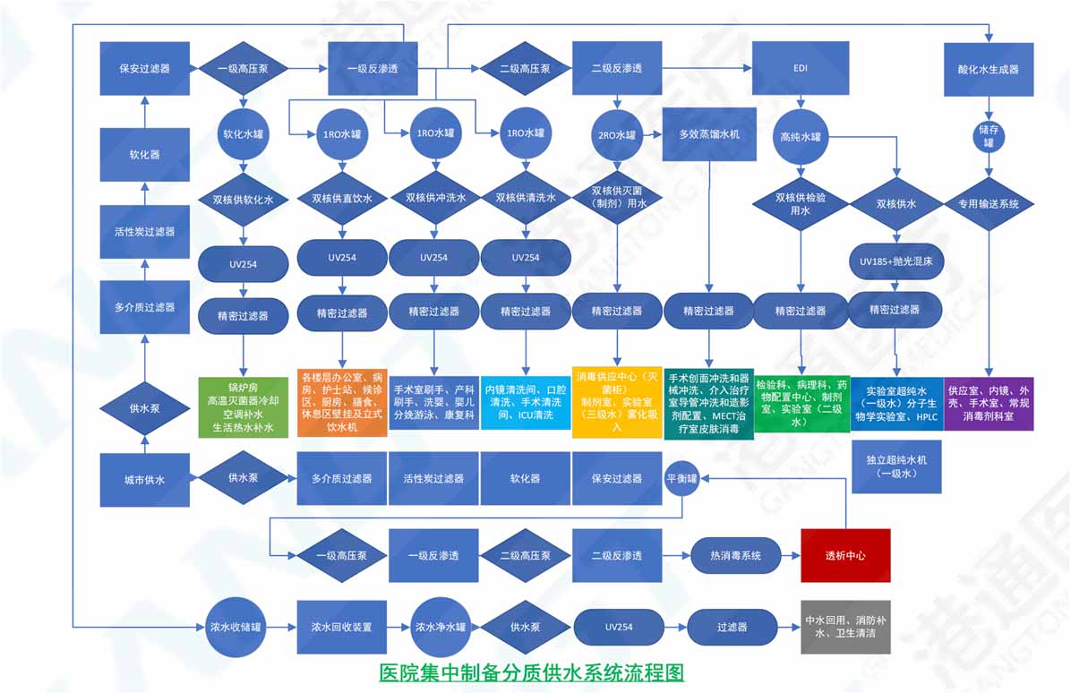 The centralized water quality supply system in hospitals is built to change the previous phenomenon of each department supplying pure water separately. The so-called centralized preparation and differentiated supply refers to the use of a water treatment system to deeply treat tap water to meet the water quality standards that can be directly used by various departments, and then supply it to the water supply systems used by each department through dedicated pipelines. A comprehensive hospital requires at least high-quality pure water such as testing water, pathology department water, hemodialysis water, central supply room water, flushing water, sterilization water, obstetric wash water, preparation room water, and drinking purified water. It consists of a pretreatment system, reverse osmosis purified water, EDI deep desalination system, and circulating water supply system. The medical pure water system includes water production equipment, water storage containers, equipment connection pipe valves, detection instruments, control systems, machine rooms, and pipe valves for various water terminals. The centralized quality water supply system in hospitals has the characteristics of water-saving, energy-saving, reducing operating costs, convenient management, and improving room utilization. It is generally used in new construction or expansion projects of hospitals.